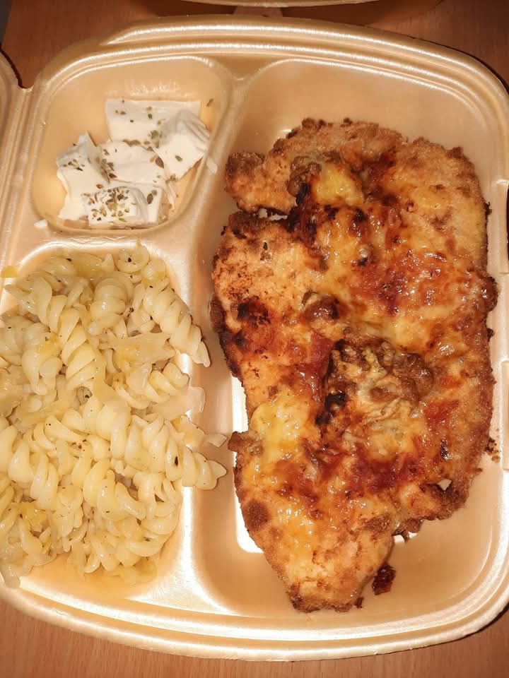 Pileća parmigana pohovana šnicla od belog mesa zapečena sa sirom i sosevima. Prilog pomfrit, riža ili testenina.